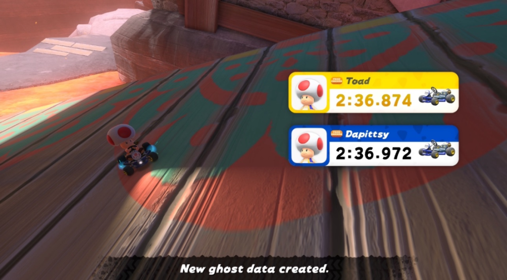 Dry Bones Burnout is the fourth and final course of the Leaf Cup in Mario Kart World and the second checkpoint of the Heart Rally. The track sits beside Bowser’s Castle in the volcanic northwest region and features a huge skeletal structure, wooden bridges, bone paths, rib tunnels, and a lake of lava. A nearby graveyard gives it a Día de los Muertos theme, and the Kamek item can transform racers into Fish Bone, Dry Bones, or Pianta.